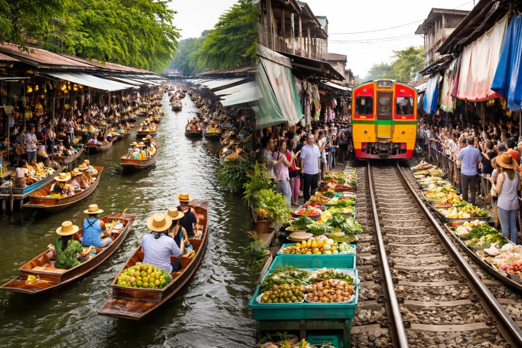 ออกเดินทางจากกรุงเทพฯ เพื่อไปสัมผัส 2 ตลาดชื่อดังระดับโลกในทริปหนึ่งวัน ที่จะพาคุณไปรู้จักเสน่ห์วิถีชีวิตไทยอย่างใกล้ชิด