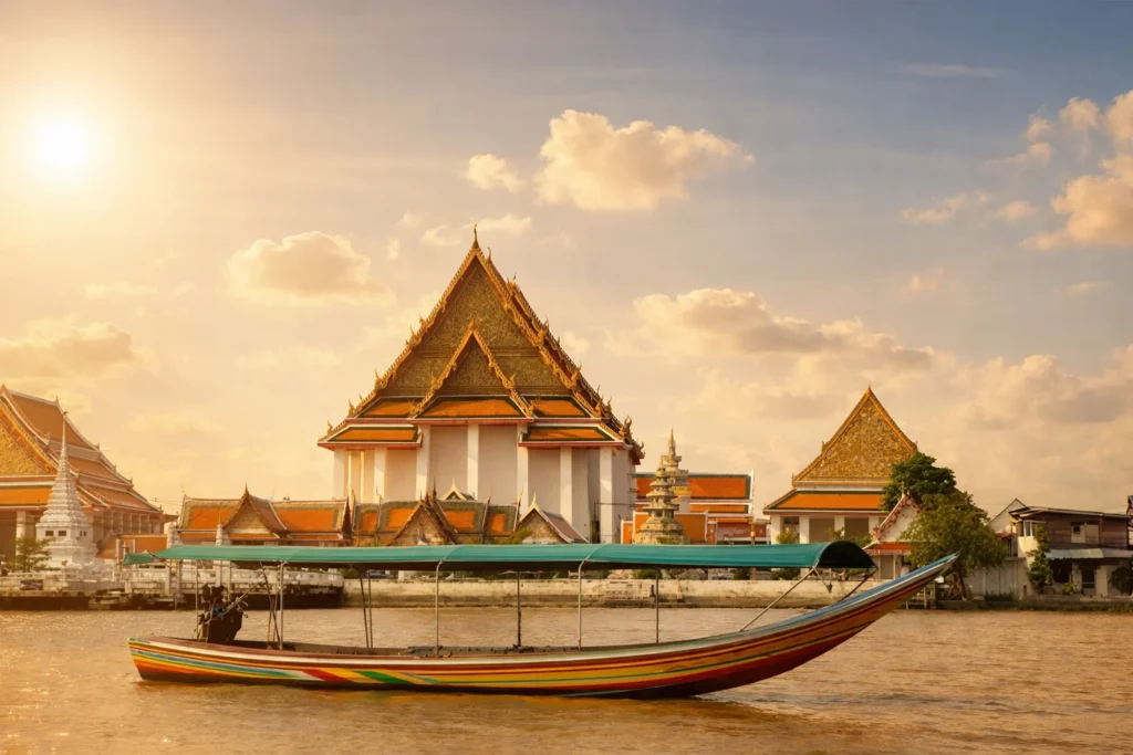 Your journey begins in Thonburi, located on the west bank of the Chao Phraya River. Here, modern skyscrapers rise alongside centuries-old temples, showcasing a striking contrast between old and new Bangkok.